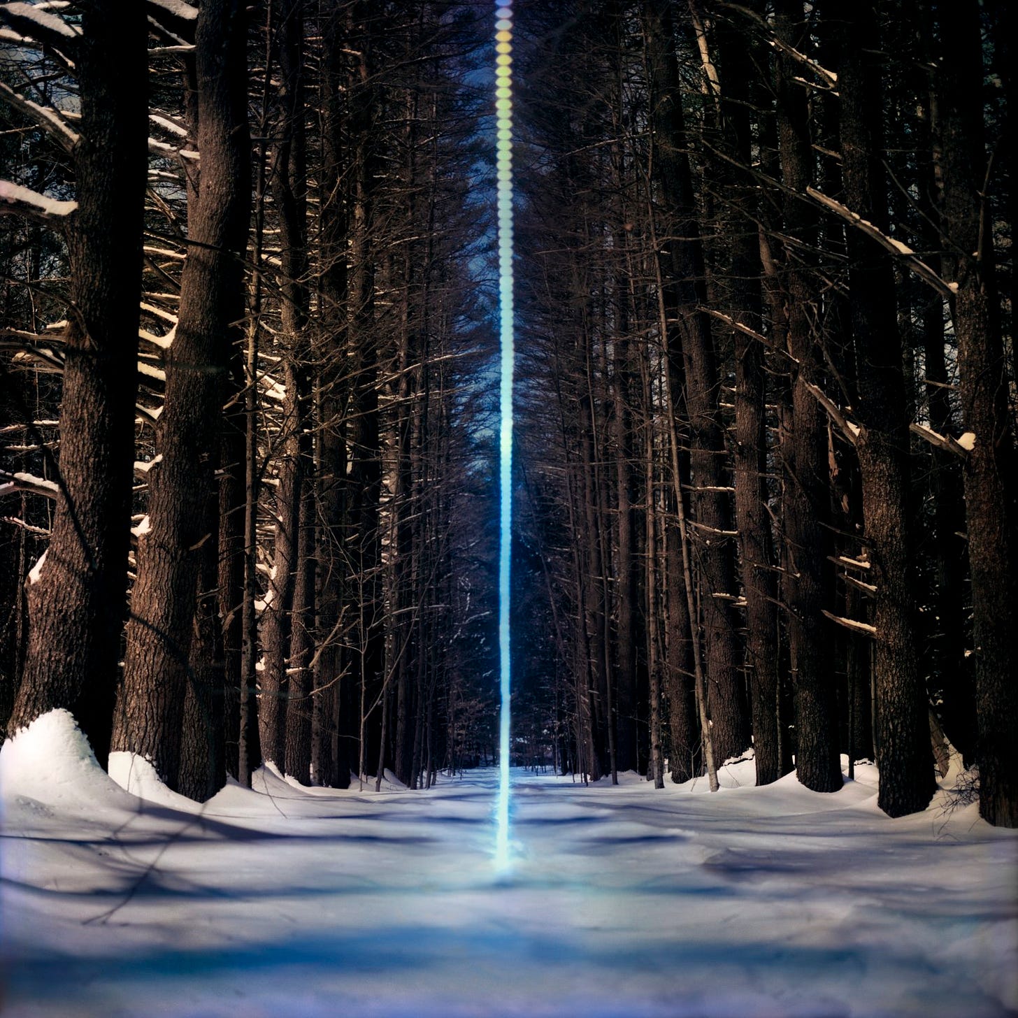 The location I chose was a pathway created over a century ago that went from a very small pond where ice was made that then led up to the main house on MacDowell’s property. Ice hasn’t been made the old fashioned way in decades, but the clear path with pines that were very much planted remains as evidence of this history. To install the 300 foot roll of rope wire light that would be featured in this piece, I worked alone, climbing the trees to build a rope suspension system between two towering pines. One rope with pulleys allowed me to move left and right across the pathway to center things, while a second rope with a centered pulley was used to raise and lower. I was hoping to put enough tension on the whole system to send the rope light back quite far, but it just made a curve instead of dropping straight down. So after a bit of troubleshooting, I managed to pull the rope light back as far as I could and secure it so it wouldn’t slide forward. Finally, I had to carefully cover my footprints with snow.