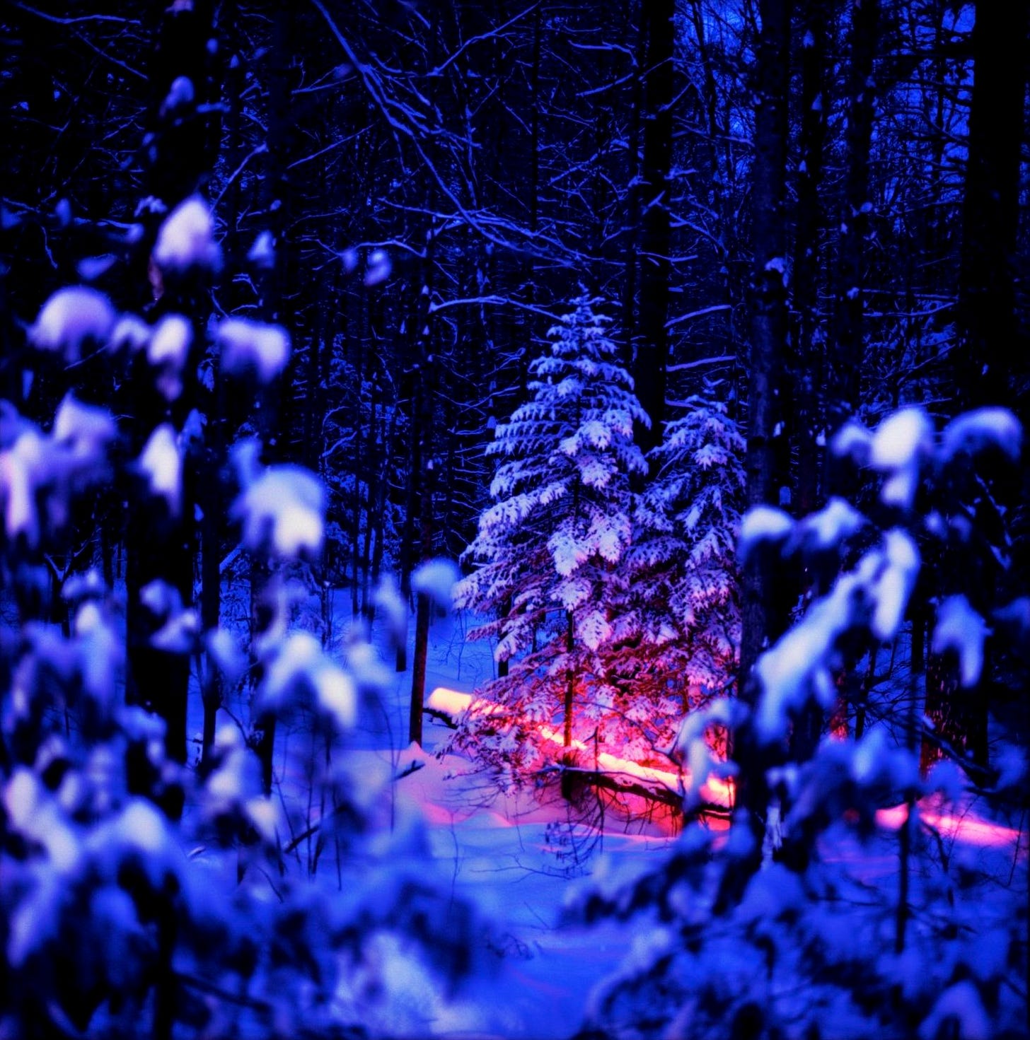 After that piece, I was looking for features in the landscape that I could work off of. I saw a tree that had fallen down, and loved the composition when looking at it through some pines atop a small hill. I photographed it shortly after a nor’easter had hit, leaving plenty of snow for the light to bounce around on. The Kelvin temperature of the scene was overwhelmingly blue, so it created an image (Pipeline (Blue)) that was more about atmospheric conditions than me manipulating anything with light. Shortly after that, the weather jumped from 15 below zero to more than 45 degrees, and everything melted. It was during the thaw that I made Pipeline (Red). It was a hard install because while there was snow on the ground when I started working, I didn’t want to make treads through it. So I had to sneak around the piece to not leave footprints that would be visible within the frame of the shot. It was such a different snow than what I had worked with just days prior.